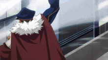 Inasa's Hero costume consists of a thick burgundy suit pinned together with yellow buttons. A cape is draped over his shoulders, the collar lined with thick fur, and it almost conceals the jetpack-like propulsion system attached to his back. His left arm is completely concealed by the thick, brown material and his hand sports a large tan glove with air pipes on it, whereas his right arm is completely exposed other than the skintight blue sleeve that appears to be apart of his undersuit. Similarly to his left hand, are several tubes around his torso and ankles, which are used to expel wind power to aid with his Quirk. Plates resembling gas masks pad his knees and left shoulder, and he completes his costume with large brown shoes and a pair of goggles around his head.